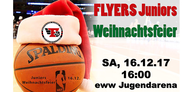 Die Raiffeisen FLYERS Wels laden herzlich zur Juniors Weihnachtsfeier! Am Samstag, 16.12.2017, um 16:00 wird in der eww Jugendarena für alle FLYERS-Kinder und ihre Eltern eine Weihnachtsfeier veranstaltet, mit Profis aus unserer Raiffeisen FLYERS-Bundesliga Mannschaft und einem tollen Show-Programm. Wir freuen uns auf euer Kommen und über freiwillige Kuchen-/Keks-Spenden. Read More