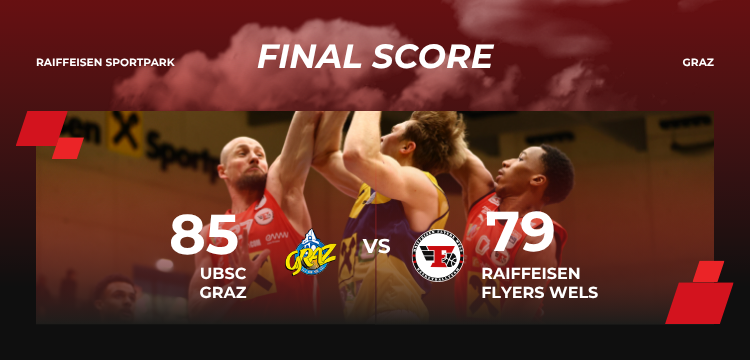 Die Raiffeisen Flyers Wels mussten sich im zweiten Spiel der Playoff-Serie dem UBSC Graz mit 79:85 geschlagen geben. Damit gleichen die Steirer die Serie auf 1:1 aus.